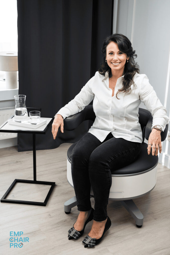Der Beckenboden besteht aus drei Muskelschichten, die willentlich oft schwer richtig anzusteuern sind. Der EMP Chair Pro arbeitet mit HI-EMP Technologie und aktiviert die Muskulatur über elektromagnetische Impulse. Dadurch können in einer Sitzung bis zu 12.000 Kontraktionen ausgelöst werden – ein Trainingsreiz, der mit klassischer Gymnastik so meist kaum erreichbar ist.